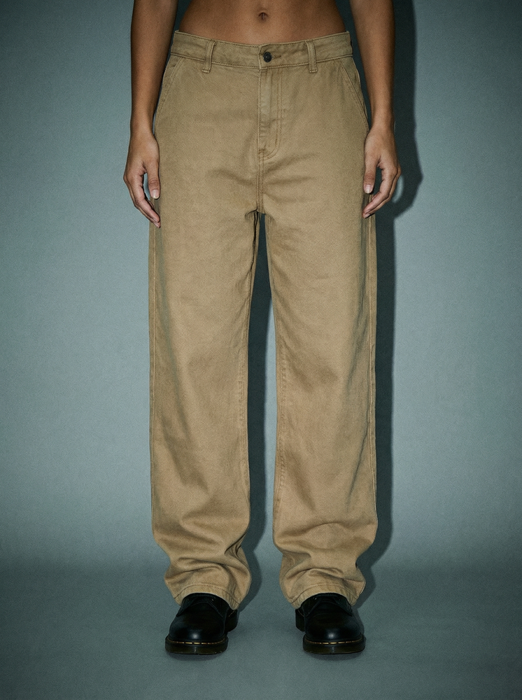 Corte baggy. Silueta relajada Tiro medio. Badana en la cintura sobre trasero derecho. Confeccionado en denim beige. 100% Algodón.