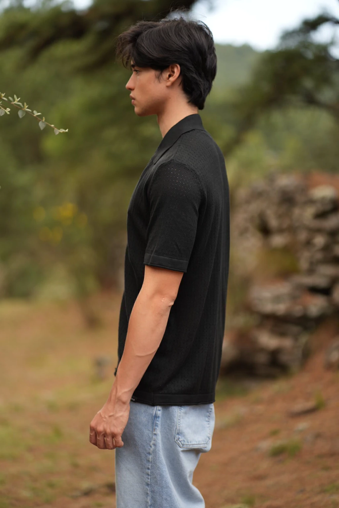 Camisa tejida mangas cortas. Corte regular. Confeccionado en tejido color negro. Botones de madera con grabado de marca.