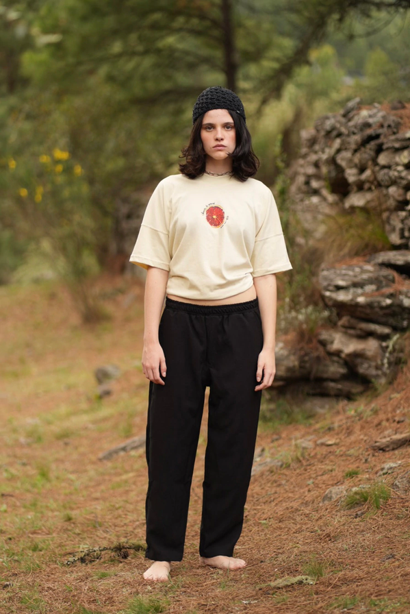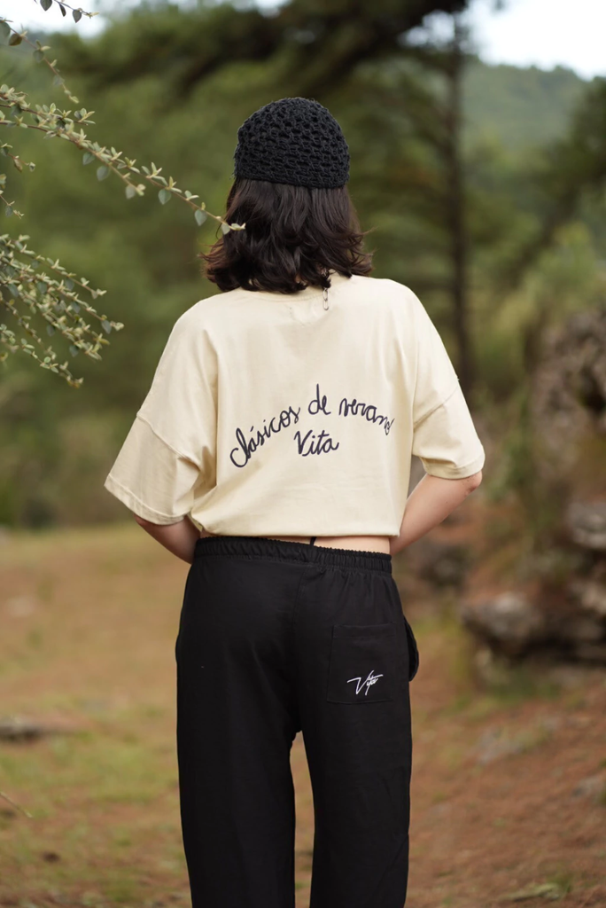 Corte recto y holgado que caen en forma cuadrada sobre el cuerpo. Mangas anchas. Cuello redondo. Confeccionada en jersey 24/1. Algodón 80% poliéster 20%. Estampada en serigrafía.