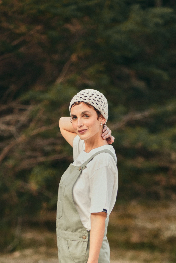 Gorro tejido calado color crudo.