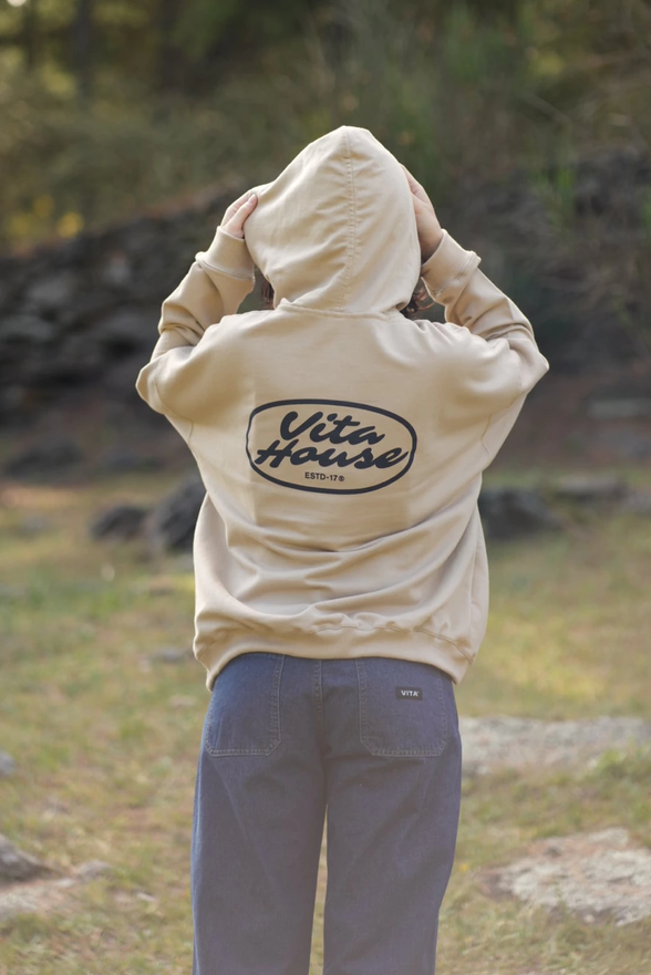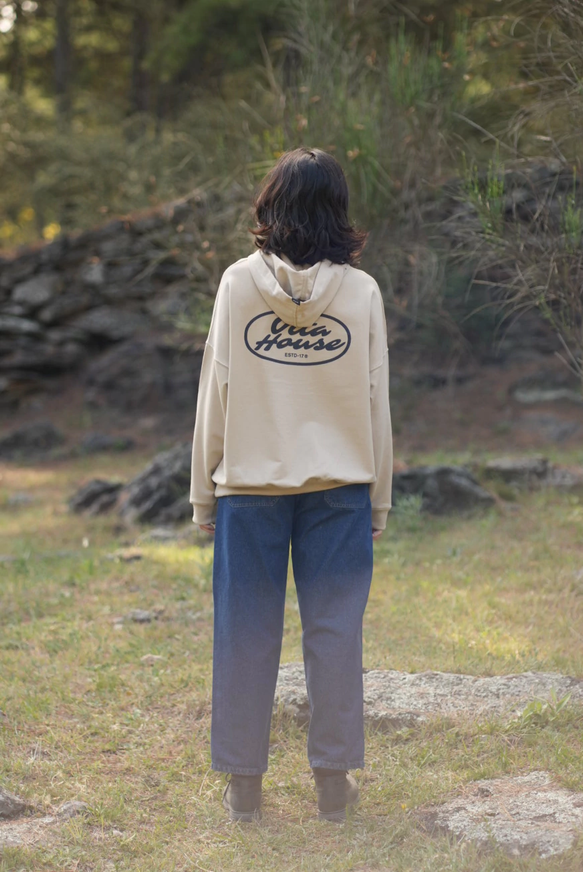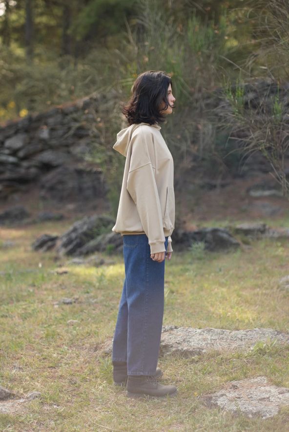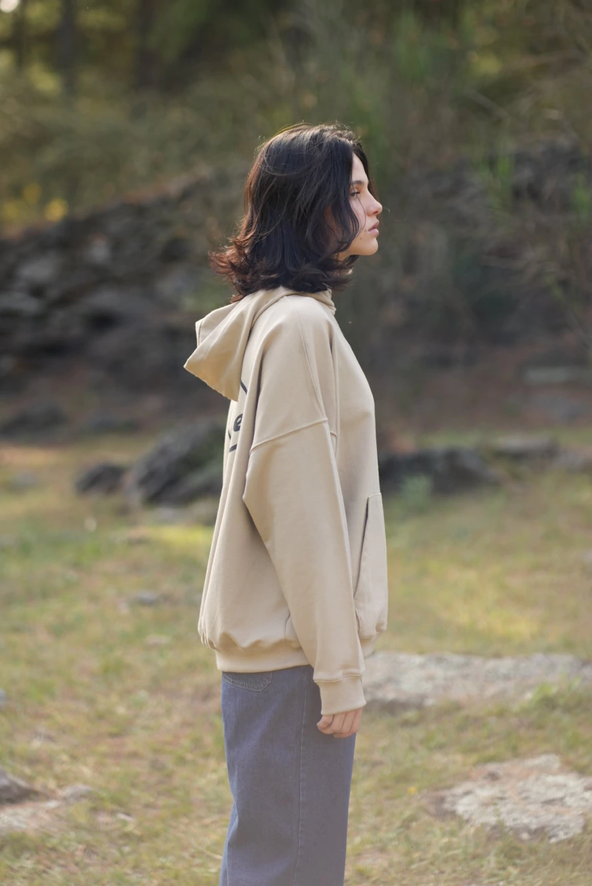 Corte oversize. Ancho de hombres caído y mangas anchas. Capucha con grifa de marca. Bolsillo tipo canguro. Confeccionado en rústico, color arena. Algodón 80% poliéster 20%. Estampado en serigrafía.