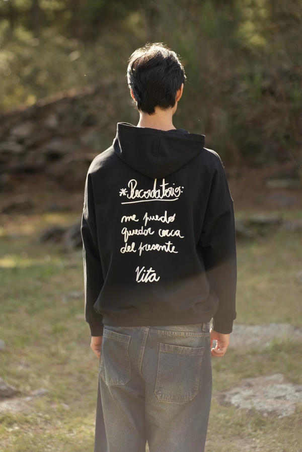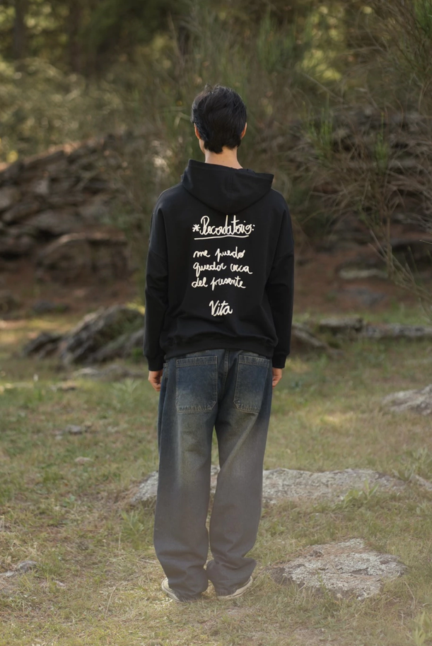 Corte oversize. Ancho de hombros caído y mangas anchas. Capucha con grifa de marca. Bolsillo tipo canguro. Confeccionado en rústico, color negro. Algodón 80% poliéster 20%. Estampado en serigrafía.