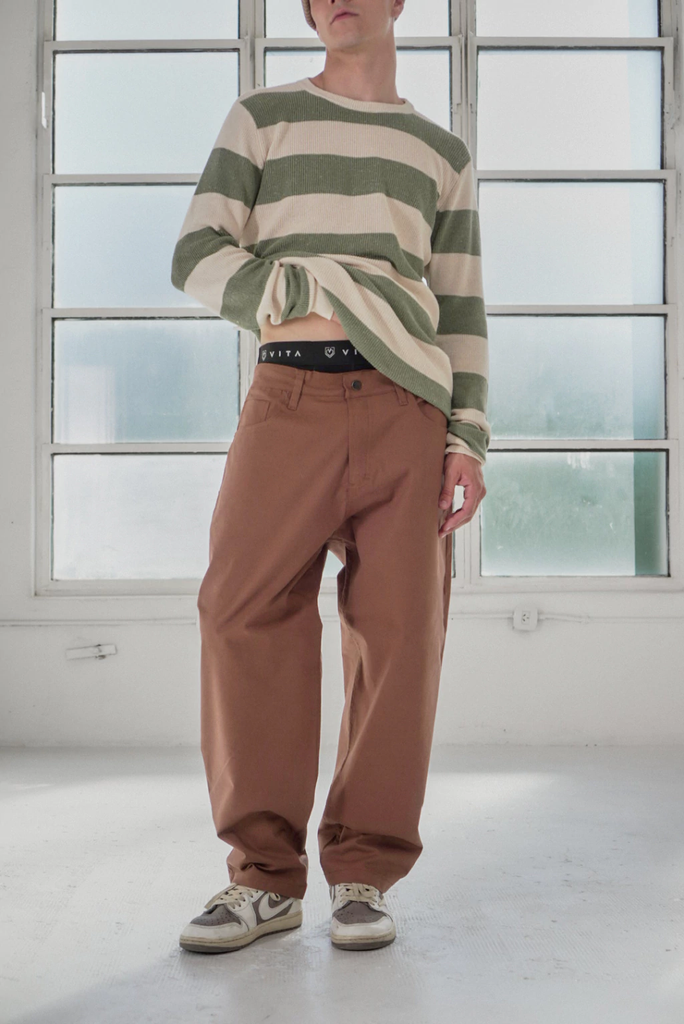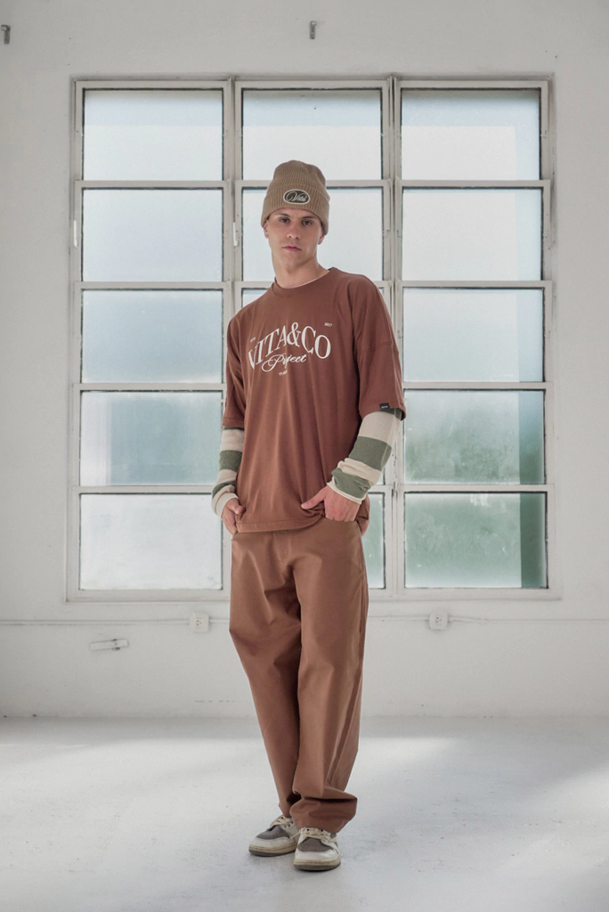 Corte baggy, ancho, corte recto. Tiro medio. Badana en la cintura, trasero derecho.