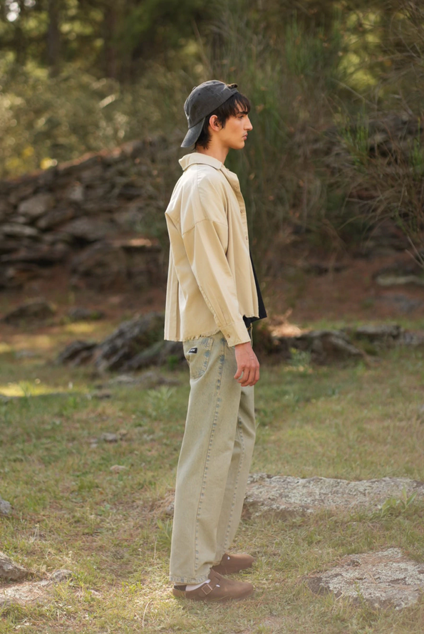 Corte boxy, recto y holgado que caen en forma cuadrada sobre el cuerpo. Mangas anchas. Confeccionado en viyela color visón lisa. Roturas deflecadas en terminaciones de cintura.