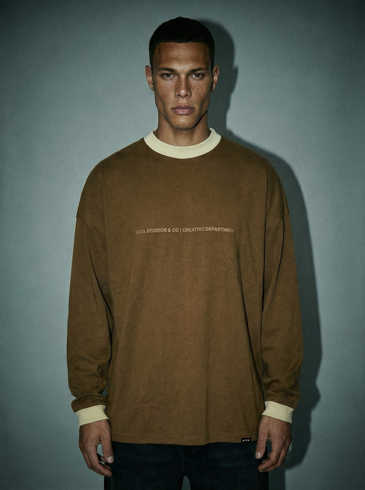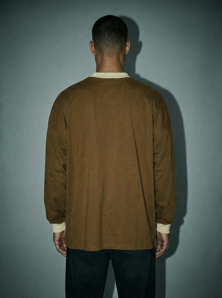 Remera de mangas largas. Corte oversize. Hombros levemente caídos y silueta amplia. Cuello redondo. Rib a contratono en puños y cuello. Estampada en serigrafía. Confeccionada en jersey 24/1. 80% algodón, 20% poliéster.