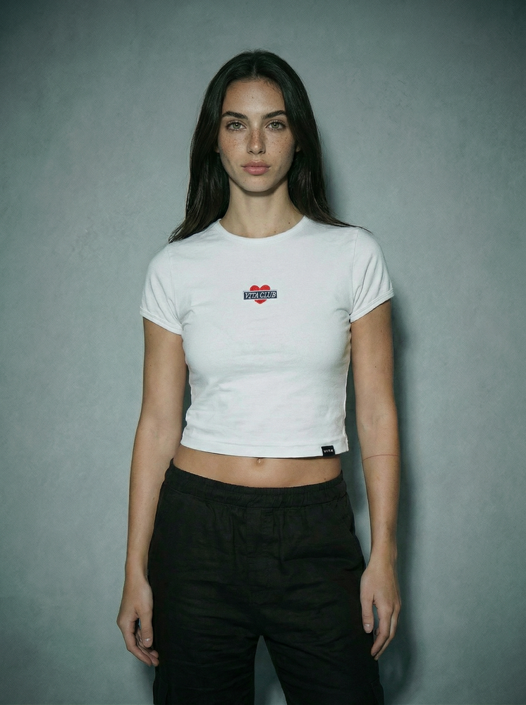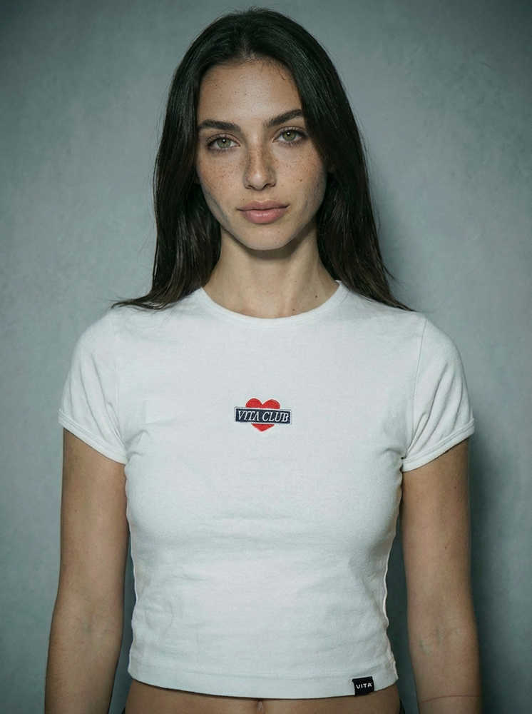 Top mangas cortas, largo a la cintura. Cuello redondo. Bordado de marca sobre frente. Confeccionado en jersey 24/1. 80% algodón, 20% poliéster.