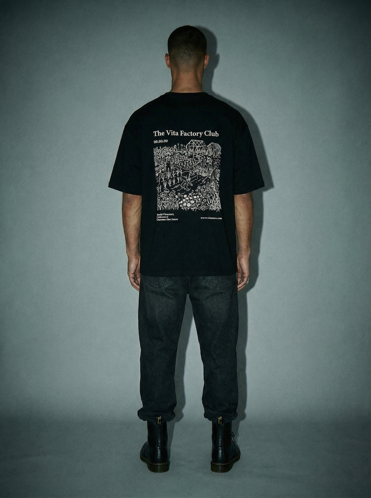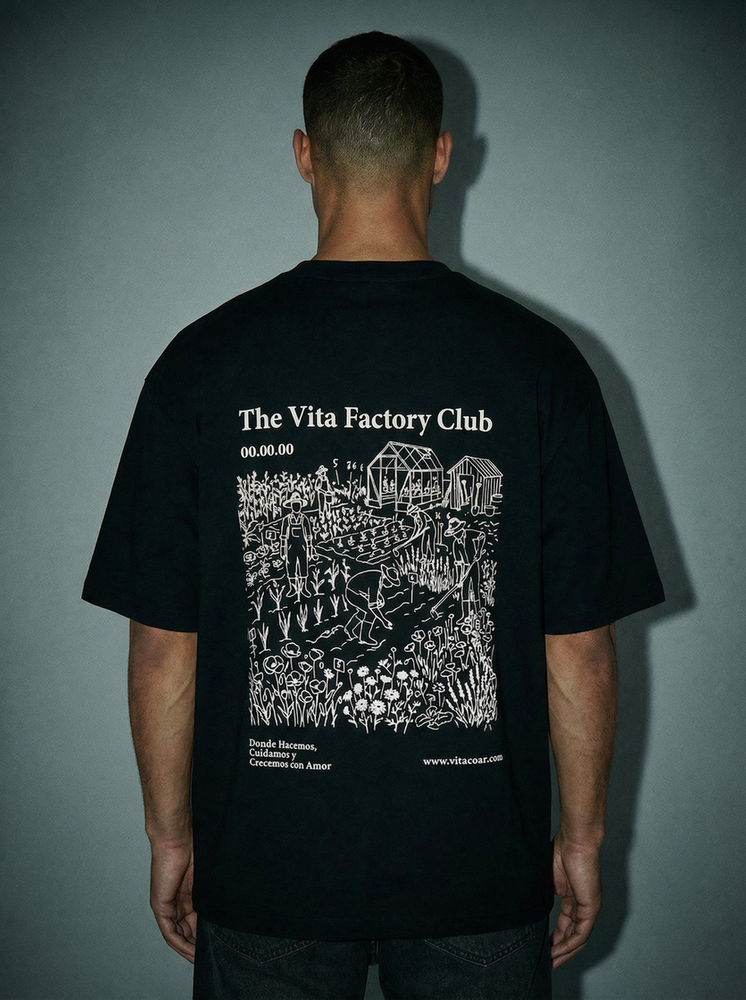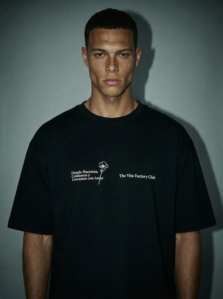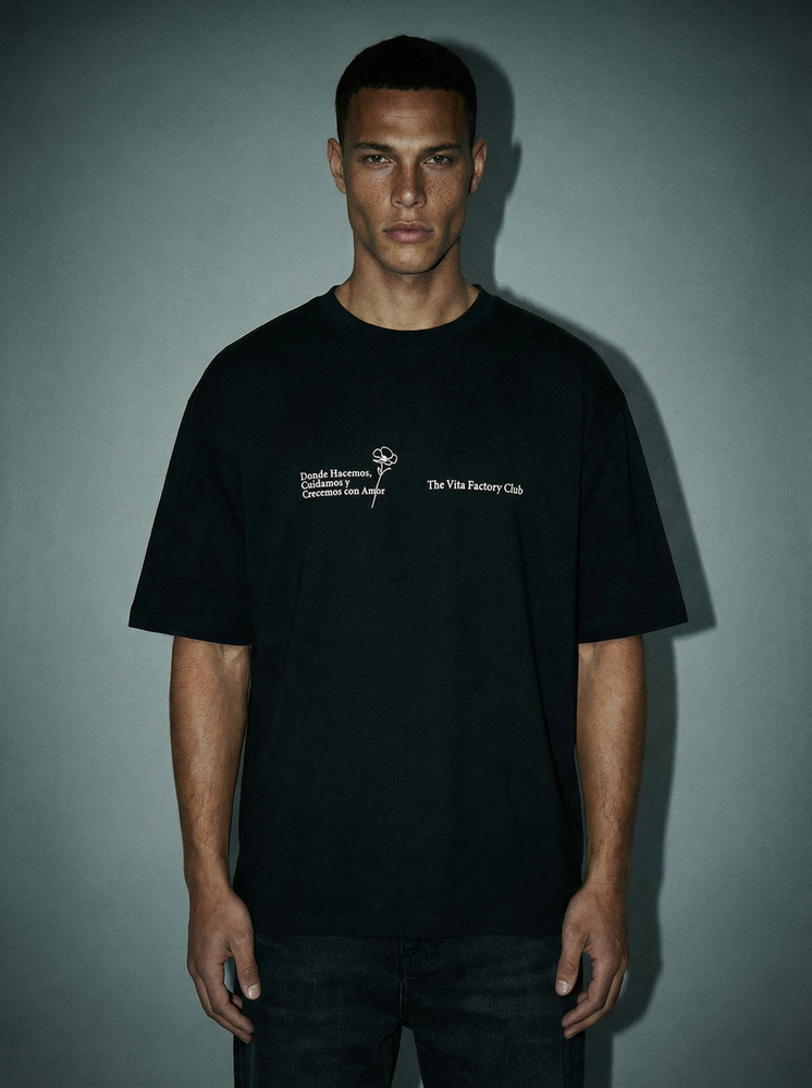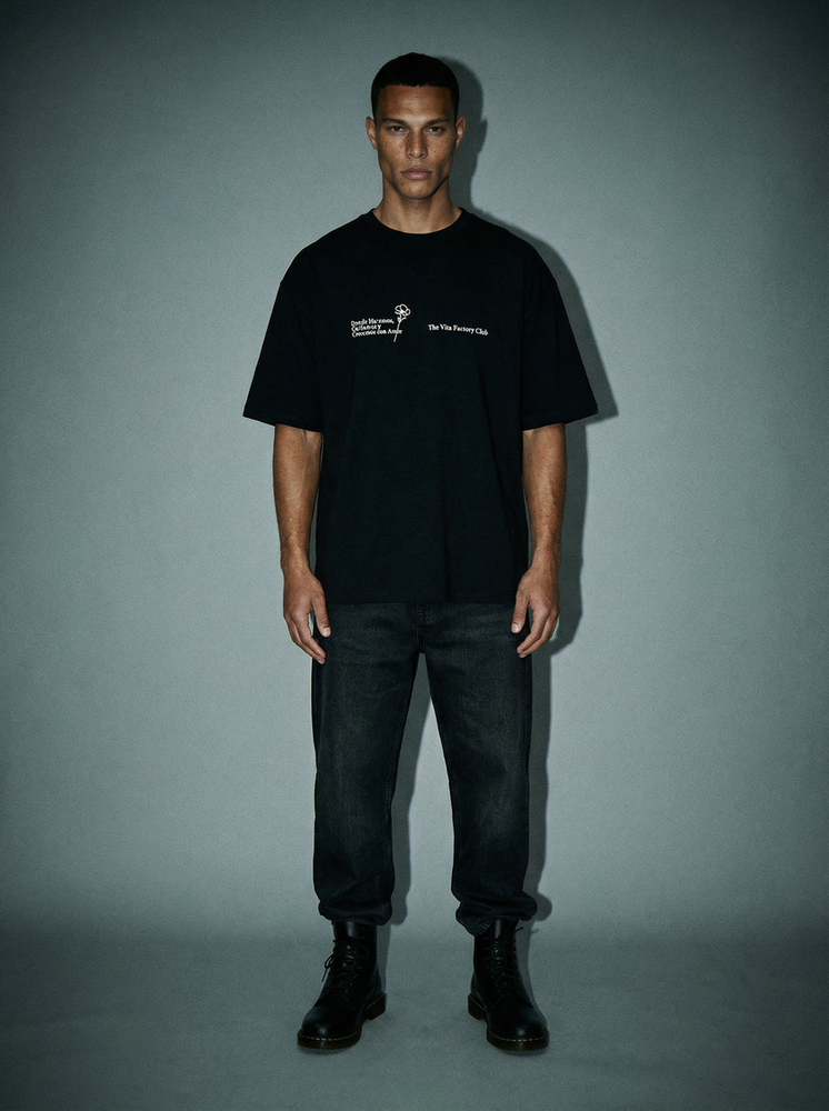Corte oversize. Hombros caídos y mangas anchas. Cuello redondo. Confeccionada en jersey 24/1. 80% algodón, 20% poliéster. Estampada en serigrafía.