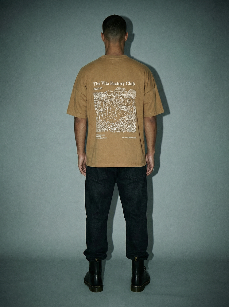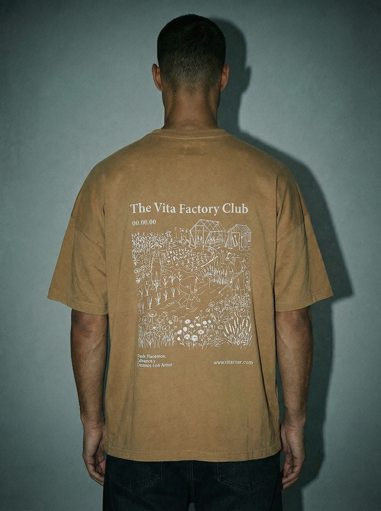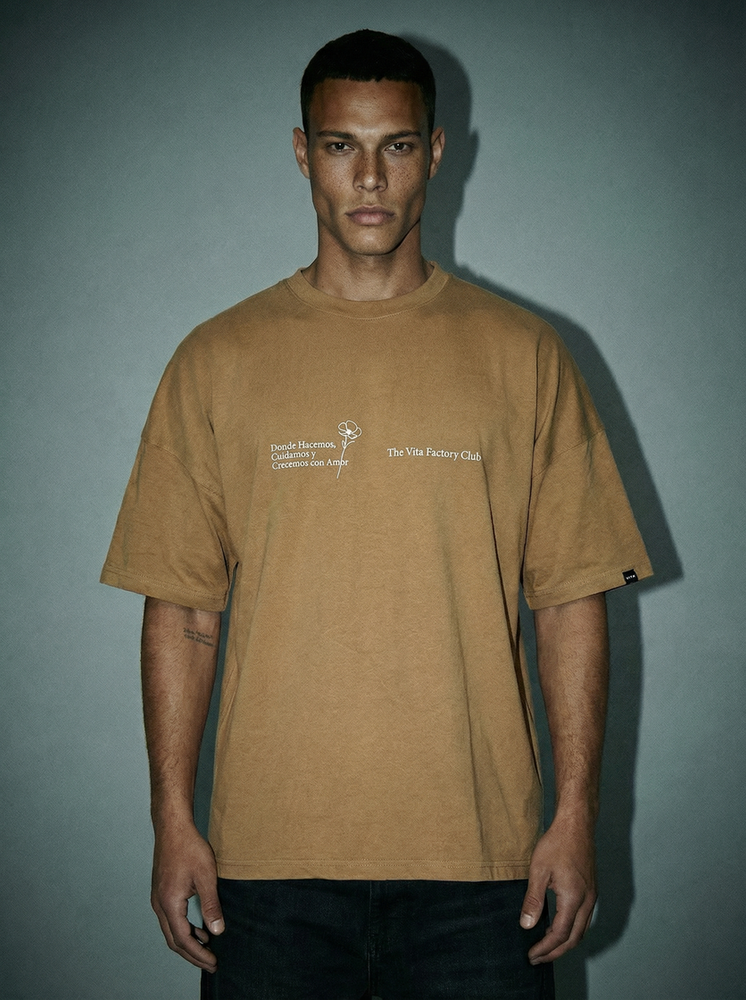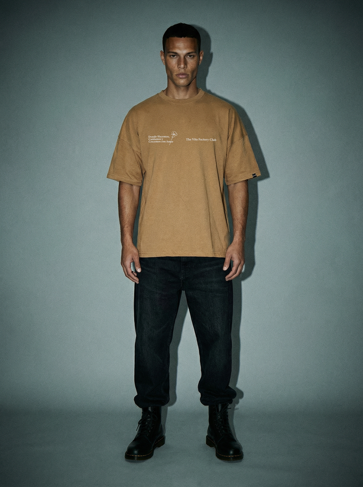 Corte oversize. Hombros caídos y mangas anchas. Cuello redondo. Confeccionada en jersey 24/1. 80% algodón, 20% poliéster. Estampada en serigrafía.