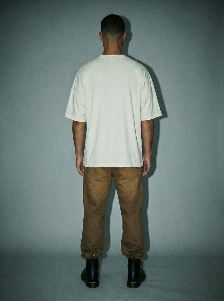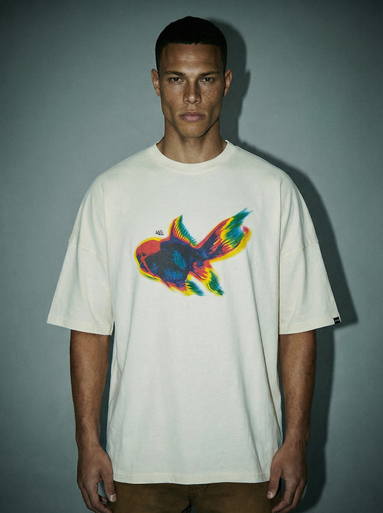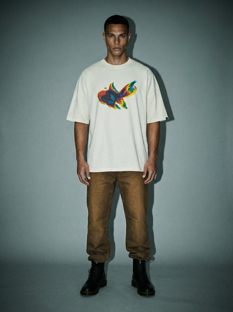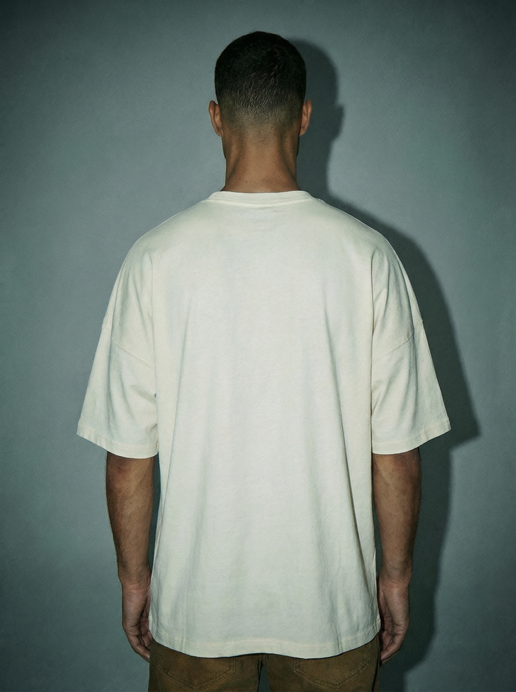 Corte oversize. Hombros caídos y mangas anchas. Cuello redondo. Confeccionada en jersey 24/1. 80% algodón, 20% poliéster. Estampada en serigrafía.