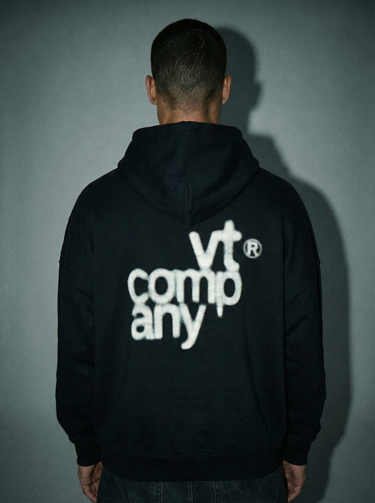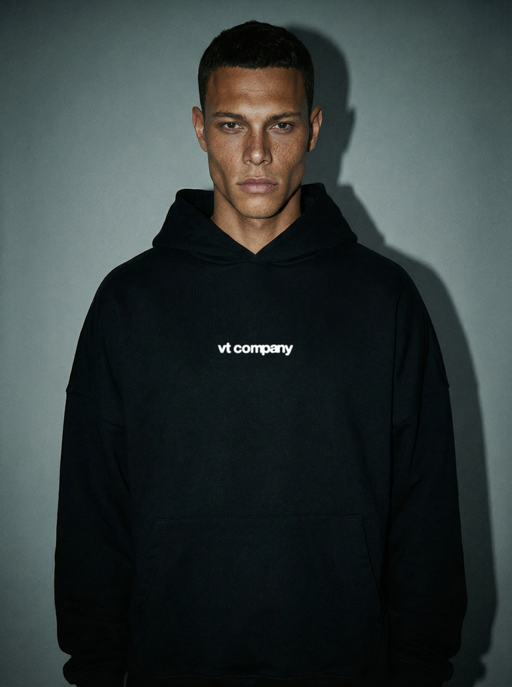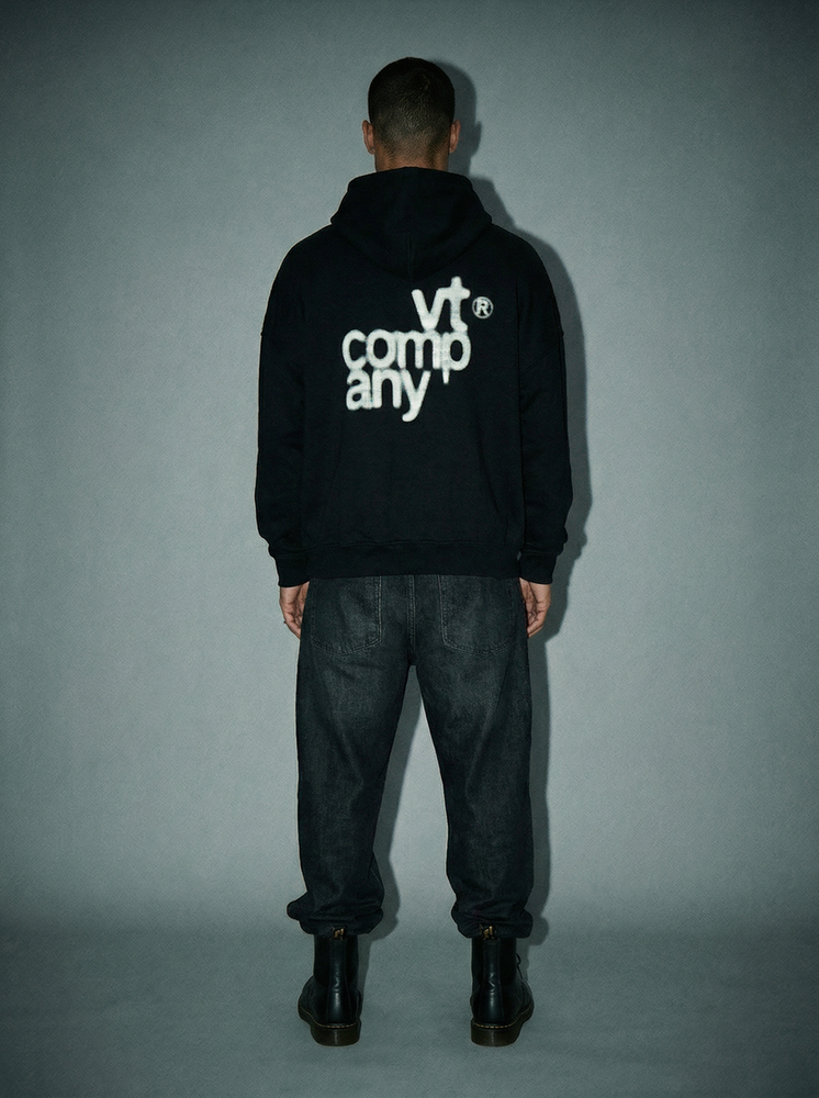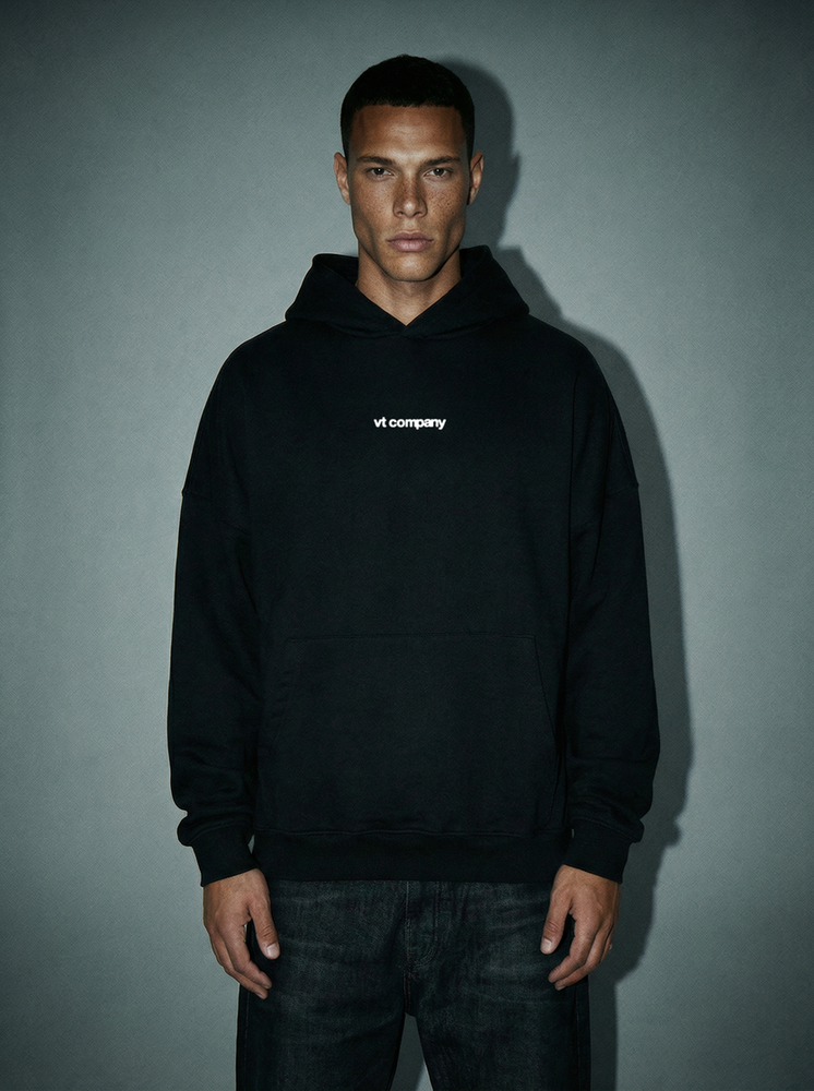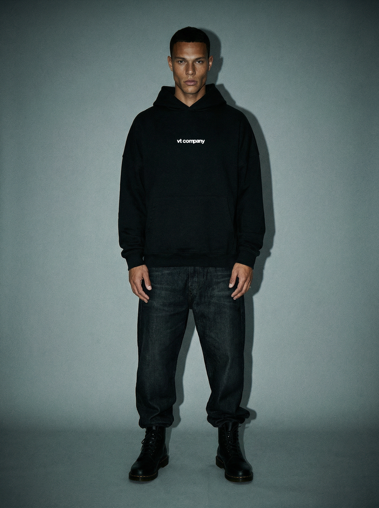Corte oversize. Ancho de hombros caído y mangas anchas. Capucha con grifa de marca. Bolsillo tipo canguro. Confeccionado en rústico, color negro. Algodón 80% poliéster 20%. Estampado en serigrafía.
