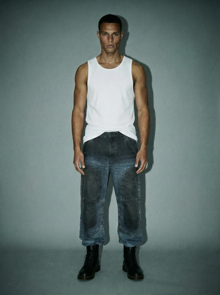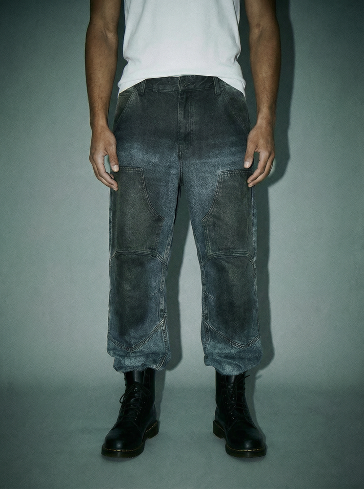 Jean con recortes y detalle en sopleteado negro. Corte baggy. Tiro medio. Badana en la cintura sobre trasero derecho. Confeccionado en denim. 100% Algodón.