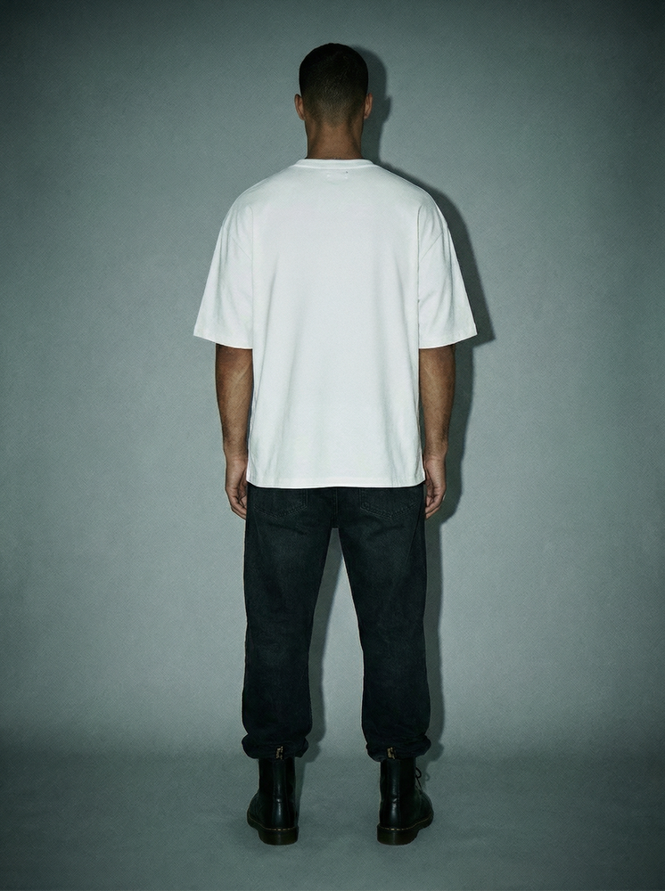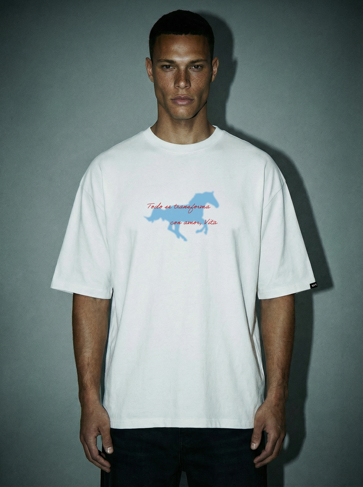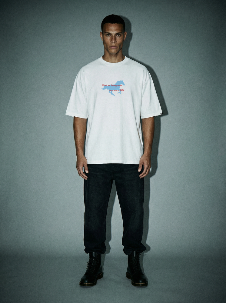Corte oversize. Hombros caídos y mangas anchas. Cuello redondo. Confeccionada en jersey 24/1. 80% algodón, 20% poliéster. Estampada en serigrafía.