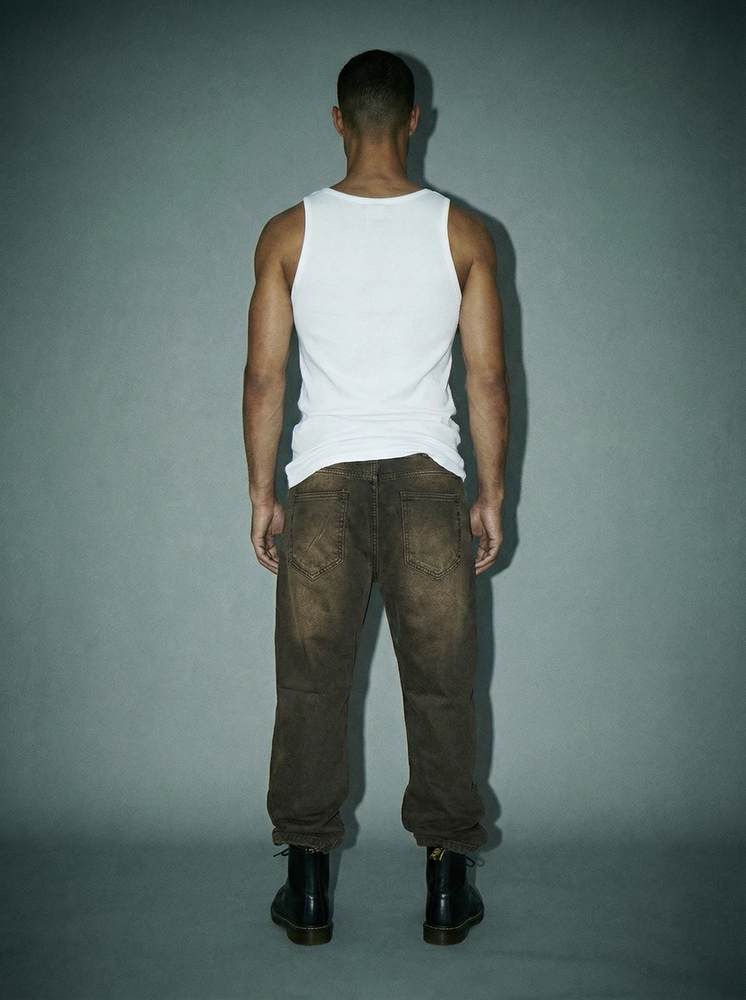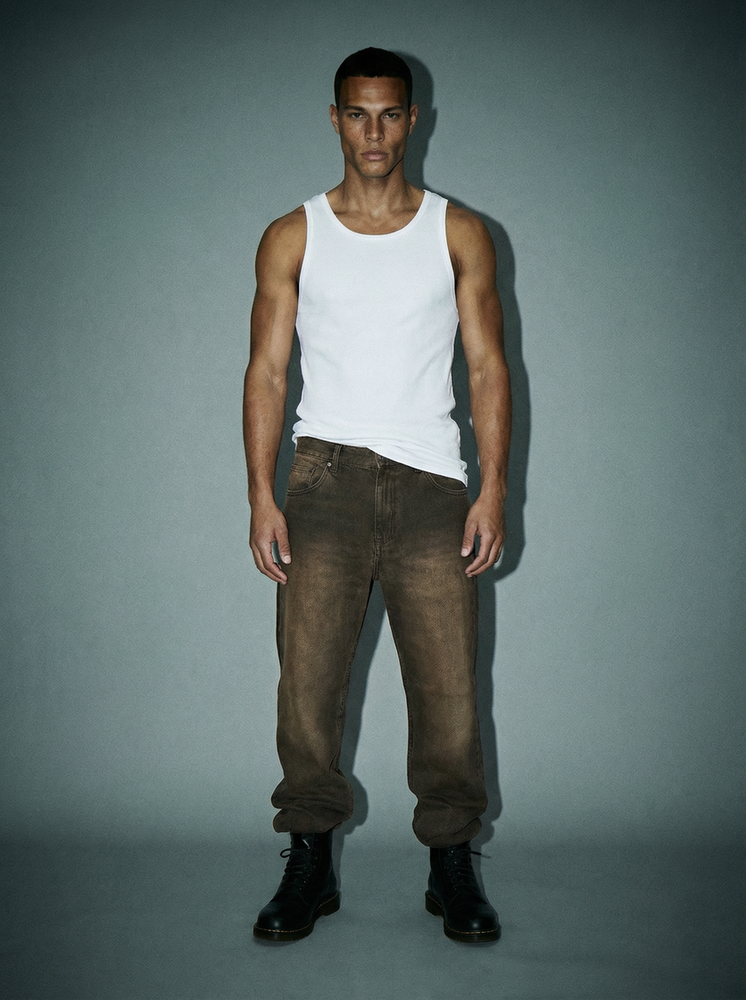Jean matizado con desgaste localizado. Corte recto. Tiro medio. Badana en la cintura sobre trasero derecho. Confeccionado en denim. 100% Algodón.